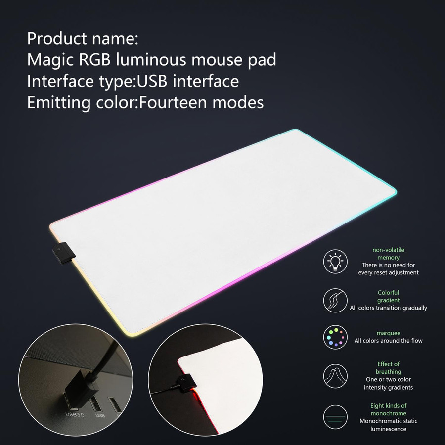 - 【14 RGB LIGHT MODES & LARGE SIZE】 The LED Mouse Pad features 14 Lighting Modes: includes 9 kinds of Monochromatic Light, 1 kind of RGB Alternating, 2 kinds of RGB Breathing, 3 kinds of RGB Running. The light is bright but not deter from viewing the monitor. The size of 31.5 x 12 inches fits your mouse and keyboard perfectly and still has a large amount of movement space.